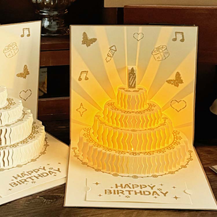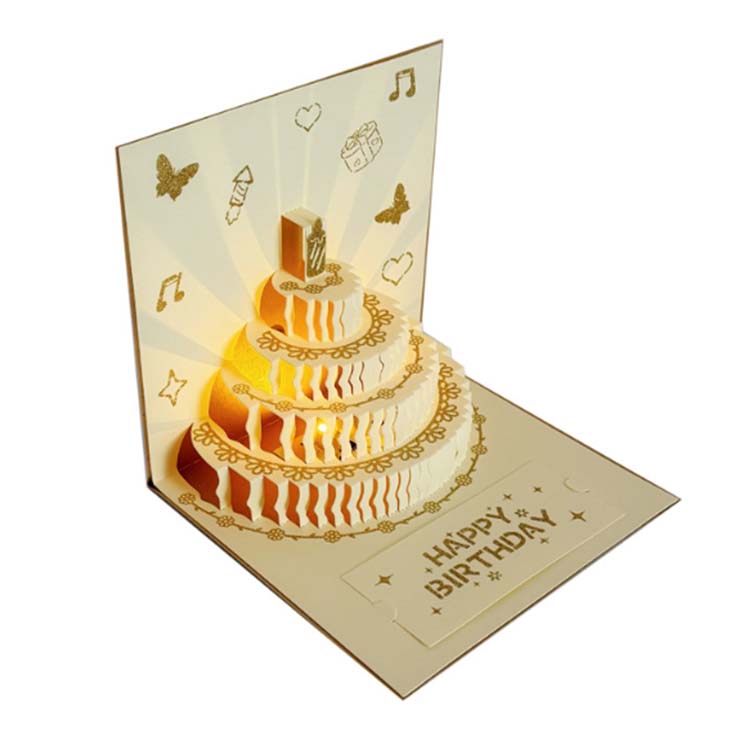 3D பிறந்தநாள் அட்டையில் மின்னணு கூறுகள் உள்ளன, இதில் விளக்குகள் மற்றும் இசை விளைவுகள் உள்ளன. அதைப் பயன்படுத்த எளிதானது.