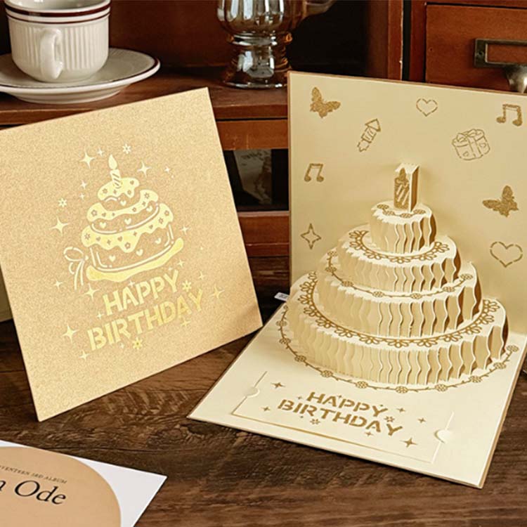 3D பிறந்தநாள் அட்டையின் அட்டைப்படம் வண்ணமயமான புடைப்பு செயல்முறையுடன் தயாரிக்கப்படுகிறது. அதன் உட்புறத்தில் 4 அடுக்கு கேக்கின் வடிவமைப்பைக் கொண்டுள்ளது, மேலும் வாழ்த்துச் செய்திக்கு ஒரு சிறிய வாழ்த்து அட்டை சேர்க்கப்படுகிறது.