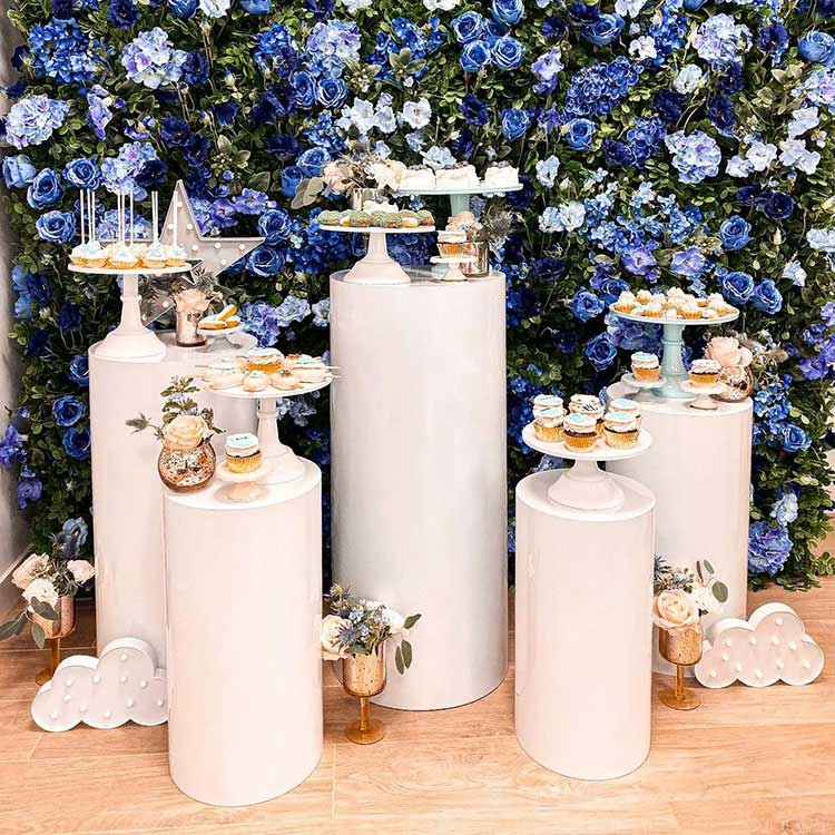உருளை அடிப்படை இனிப்பு அட்டவணை ஒரு கொள்கலனாகவும் ஆபரணமாகவும் செயல்படுகிறது. வழக்கமாக, அவை பல்வேறு சேர்க்கைகளில் வருகின்றன: 3-துண்டு சேர்க்கைகள், 5-துண்டு சேர்க்கைகள், 7-துண்டு சேர்க்கைகள் மற்றும் பல. மிகவும் பொதுவான கலவை ஐந்து துண்டுகள். பல்வேறு அளவுகளில் சுயாதீன உருளை குழாய்கள் நெகிழ்வான முறையில் ஏற்பாடு செய்யப்படலாம், மேலும் அவை காட்சியின் முக்கிய பகுதியாகும். அதே நேரத்தில், அளவு மற்றும் வடிவத்திற்கான தனிப்பயனாக்கத்தையும் நாங்கள் வழங்குகிறோம். மேலும், அவை உங்கள் விருந்து அலங்காரங்களுடன் பொருந்துகின்றன.