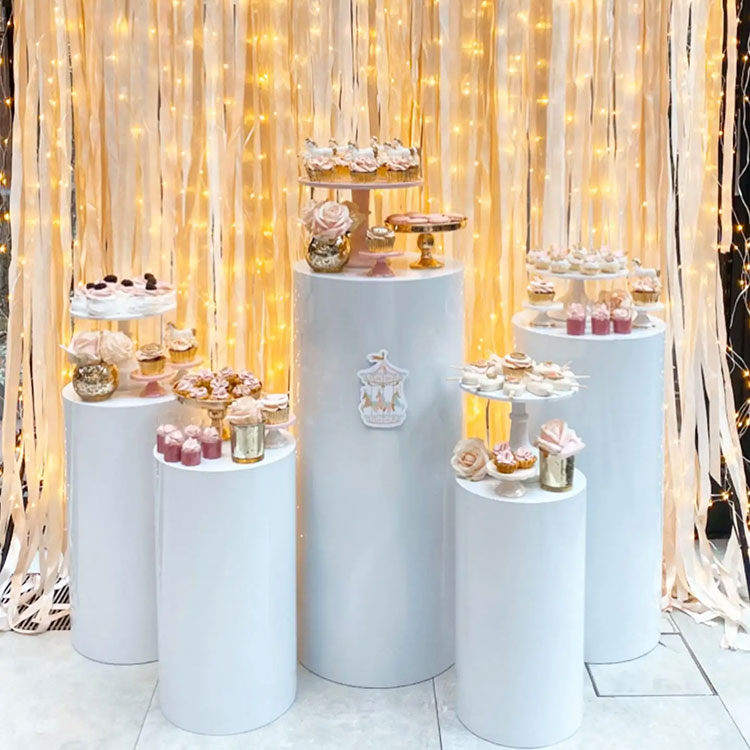 உருளை வடிவ இனிப்பு அட்டவணை உலோகத்தால் ஆனது மற்றும் ஒப்பீட்டளவில் குறைந்த எடை கொண்டது. அவை உறுதியானவை மற்றும் நீடித்தவை.எனவே, இது ஒரு நல்ல அமைப்பை வழங்குவதோடு மட்டுமல்லாமல், பயனர்கள் அவற்றை ஏற்பாடு செய்வதற்கும் வசதியாக இருக்கும். விழாவின் மையப்புள்ளியாக, அவர்கள் நிகழ்வில் பங்கேற்ற ஒவ்வொருவருக்கும் ஒரு அற்புதமான நினைவகத்தையும் மகிழ்ச்சியையும் பகிர்ந்து கொள்வார்கள்.