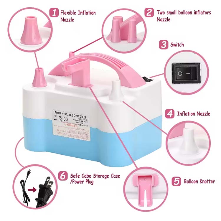 முடிச்சர் இரட்டை முனை கொண்ட மின்சார பம்ப்இரட்டை முனை வடிவமைப்பைக் கொண்டிருங்கள்: ஒரே நேரத்தில் இரண்டு பலூன்களை உயர்த்தலாம், செயல்திறனை இரட்டிப்பாக்குகிறது.