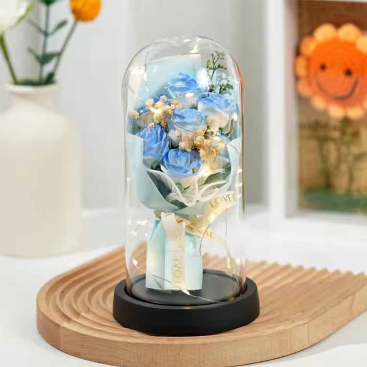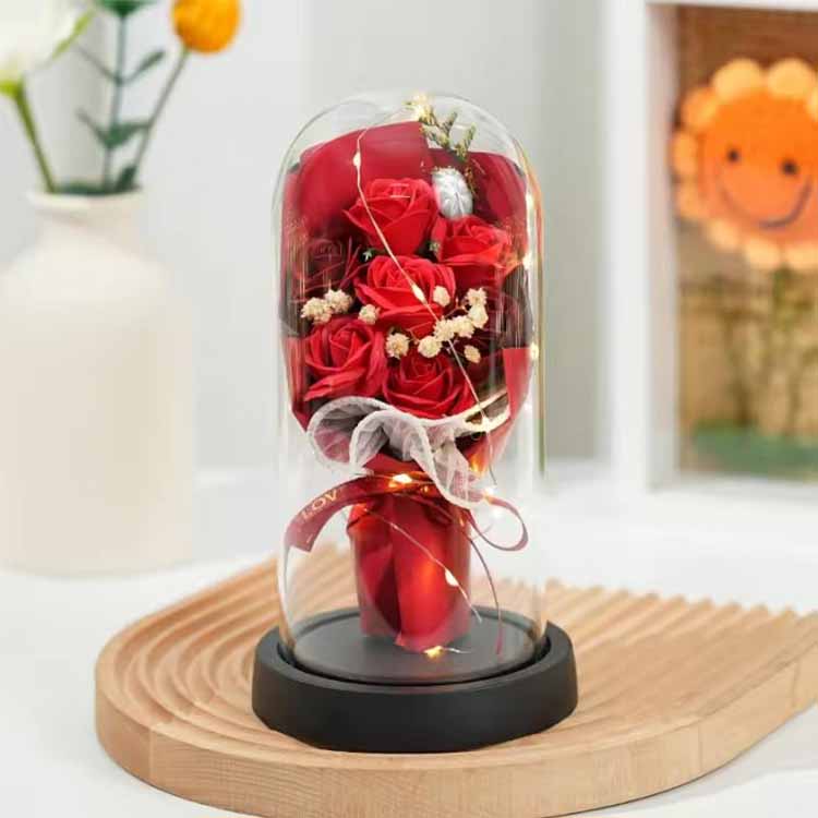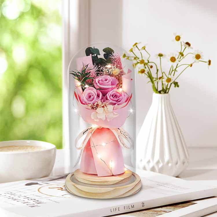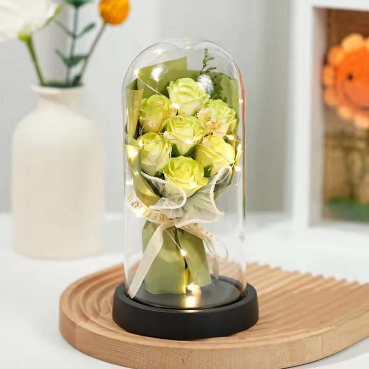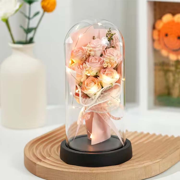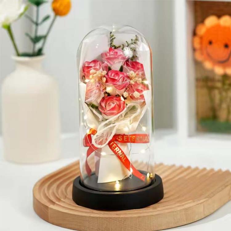 கண்ணாடி டோம் சோப் ரோஜா பூங்கொத்து சோப்புப் பூக்கள் மற்றும் பாதுகாக்கப்பட்ட பூக்களுடன் இணைந்து பயன்படுத்தப்படுகிறது. எல்இடி விளக்குகள் சூடான மற்றும் ஒளிரும் ஒளியைப் பயன்படுத்துகின்றன, இது காட்சிகளை அலங்கரிக்கும் போது சூடான சூழலை சேர்க்கும். உள்ளமைக்கப்பட்ட எல்இடி லைட் சரத்தில் வண்ணமயமான ஒளிரும் விளக்குகள் உள்ளன, மேலும் வண்ணங்களை உங்கள் தேவைகளைப் பூர்த்தி செய்ய தனிப்பயனாக்கலாம். மேலும் கொடுக்கலாம் ஒரு பரிசாக.நித்திய பூக்கள் வாடுவதில்லை, கண்ணாடி மூடியிருந்தாலும் நிறம் மாறாது. சோப்பு பூக்கள் கைகளை கழுவவும் அல்லது வாசனையாகவும் பயன்படுத்தலாம். இந்த ரோஜா பூச்செண்டு சிக்கனமானது மற்றும் நடைமுறையானது.