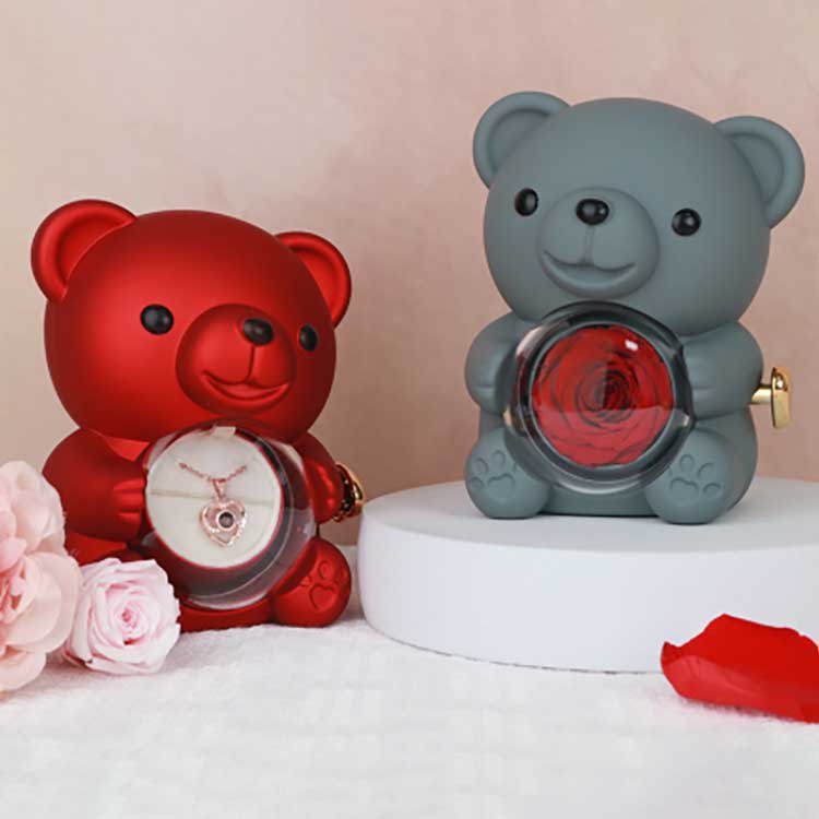 இந்த ஹக் பியர் ரோஸ் நகைப் பெட்டியானது மேசை, புத்தக அலமாரி அல்லது படுக்கை மேசையில் காட்சிப்படுத்தப் பயன்படுகிறது. அதன் மிகவும் கண்கவர் அம்சம் மையத்தில் பாதுகாக்கப்பட்ட ரோஜா ஆகும். ரோஜாவைத் திறப்பது நகைகள், மோதிரங்கள் அல்லது நினைவுப் பொருட்களை சேமிப்பதற்கான ஒரு பெட்டியை வெளிப்படுத்துகிறது.