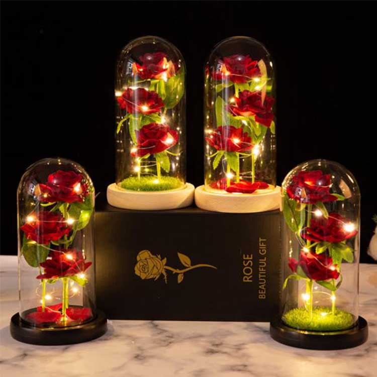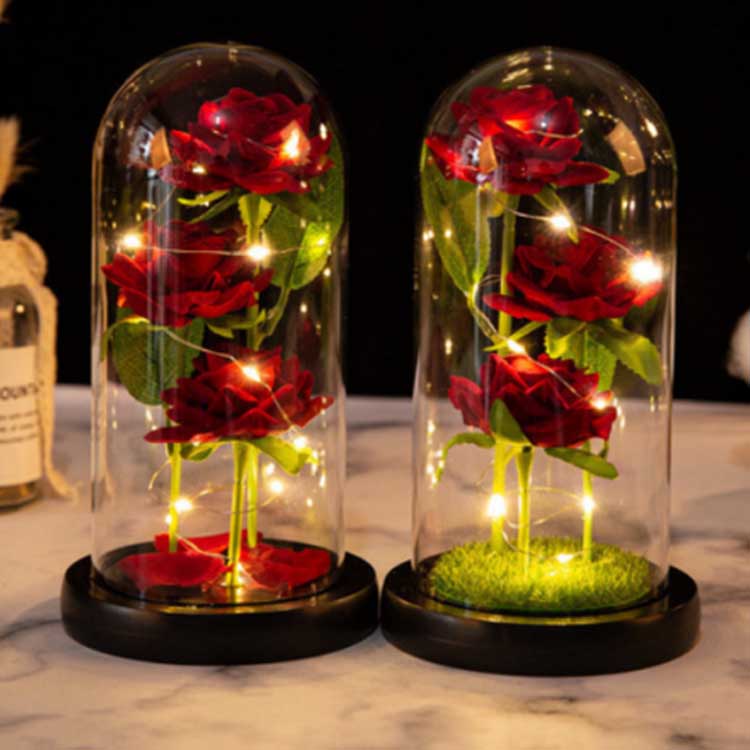 ரோஜாக் கண்ணாடிக் குவிமாடத்தின் உள்ளே, யதார்த்தமான தண்டுகள் மற்றும் பச்சை இலைகளுடன், வெவ்வேறு உயரங்களில் பாதுகாக்கப்பட்ட மூன்று மலர்கள் வைக்கப்பட்டுள்ளன. கண்ணாடி உறை வெப்பத்தைத் தாங்கும் மற்றும் எளிதில் சேதமடையாது. எல்.ஈ.டி சரம் விளக்குகள் உள்ளமைக்கப்பட்ட மென்மையான விளக்குகள் மற்றும் சுவிட்ச் மரத்தடியின் கீழ் அமைந்துள்ளது. தனிப்பயனாக்கக்கூடிய பரிசு அட்டை.